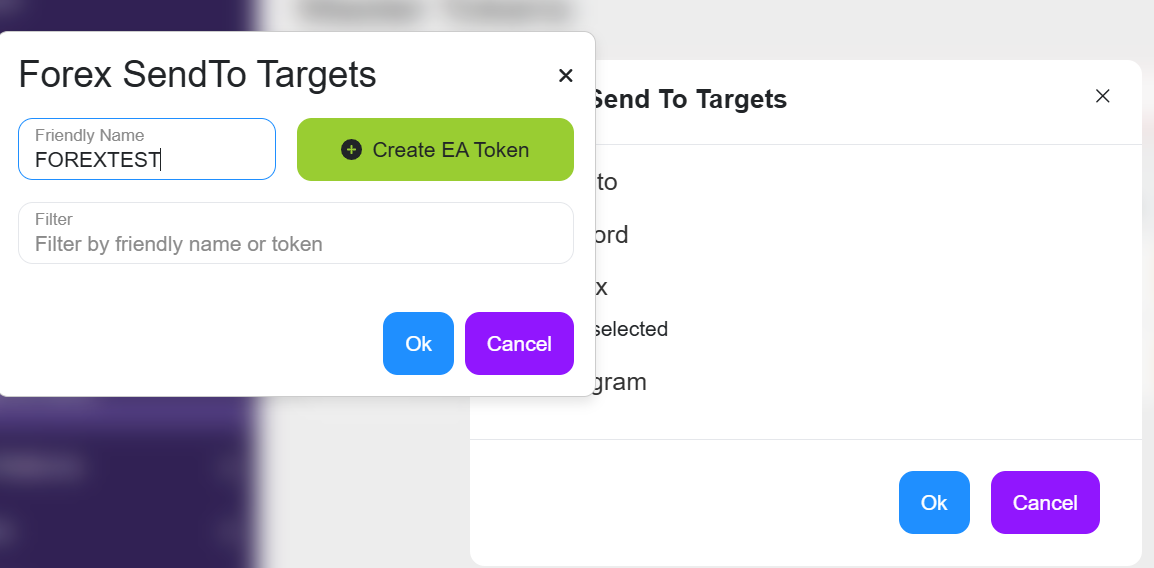 When you select Forex as the Send-To Target and click Enable , the system will ask you to Create an EA Token .