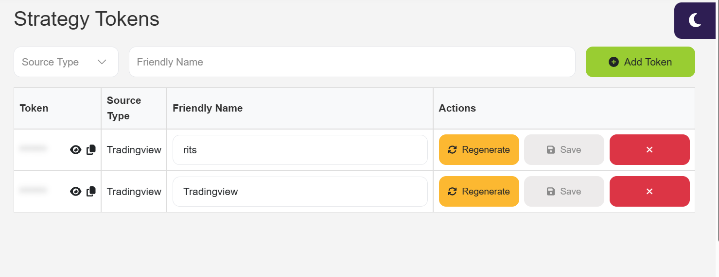 A Strategy Token defines how the system should interpret your chart signals (e.g., TradingView alerts) and convert them into actionable trading strategies.