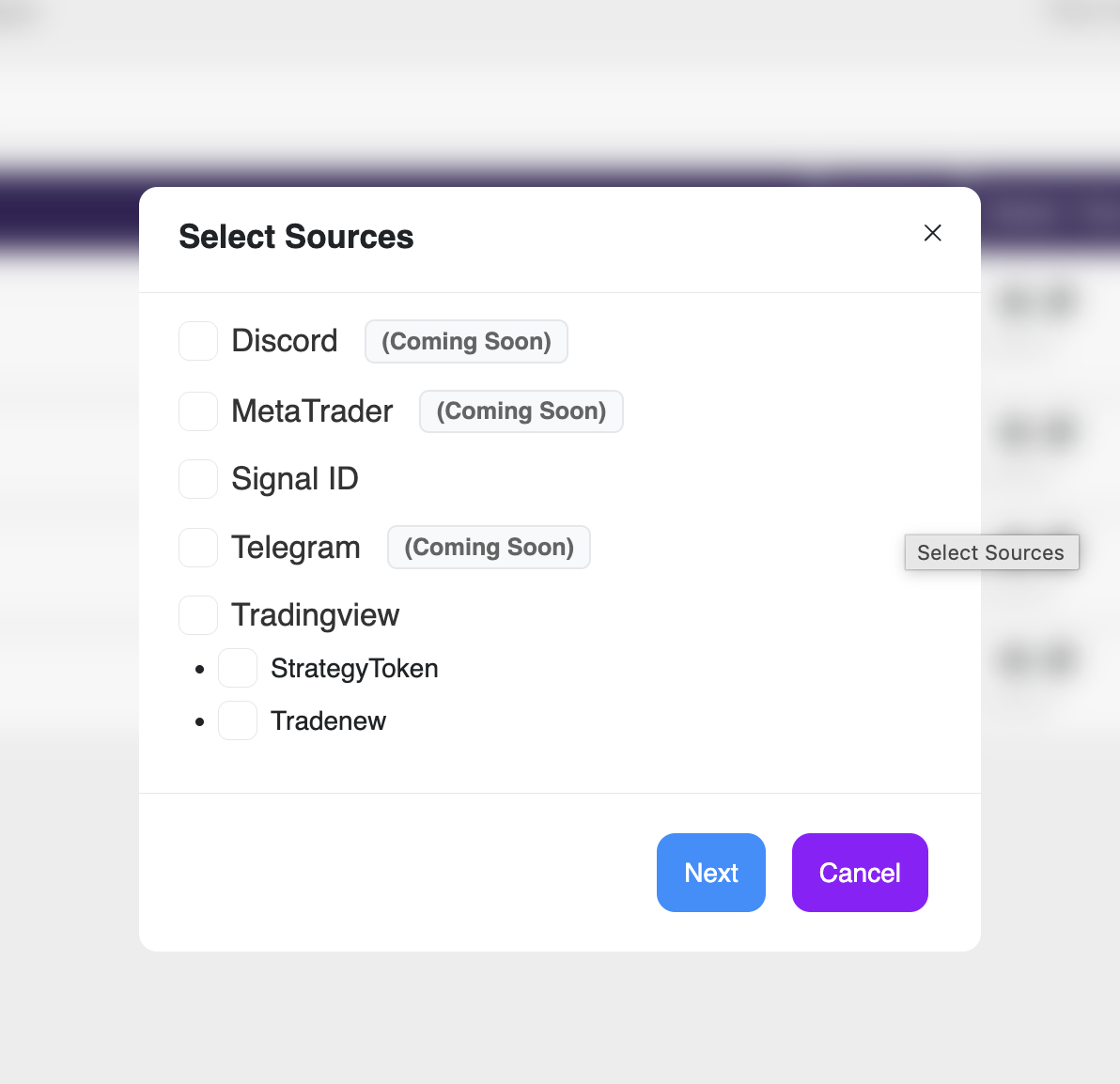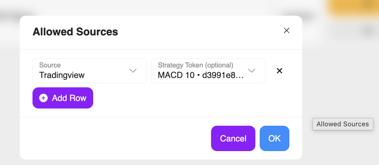 - Once a new Master Token is created, select the Sources you want to receive signals from (e.g., TradingView or MetaTrader).