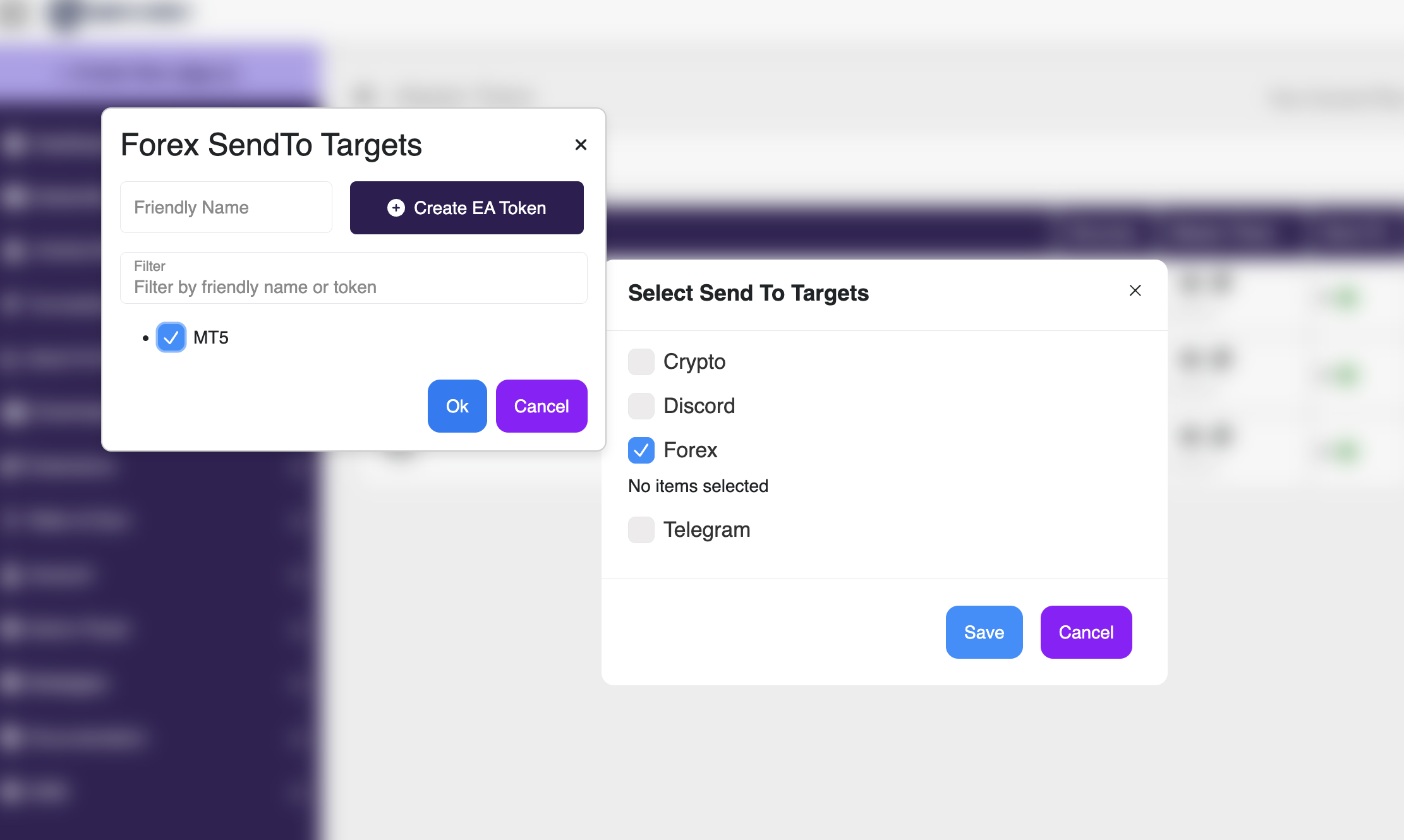 When you select Forex as the Send-To Target and click Enable , the system will ask you to Create an EA Token .